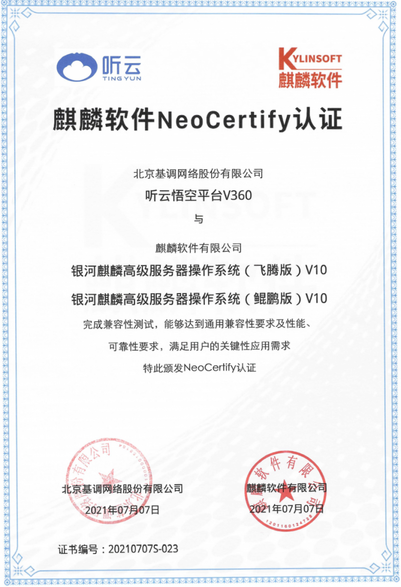 近期,北京基调网络股份有限公司(以下简称“听云”)与麒麟软件、湖南长城科技信息有限公司、飞腾信息技术有限公司、东方通、达梦数据库等多家业内知名企业完成信创产品互认。听云自主研发的【听云平台】与各企业在产品功能、兼容性、性能等方面能够完全兼容,并保证整体运行稳定高效!未来,听云将就新项目、新产品、解决方案与合作伙伴进行全面建设配合工作,携手并进,实现互利共赢。